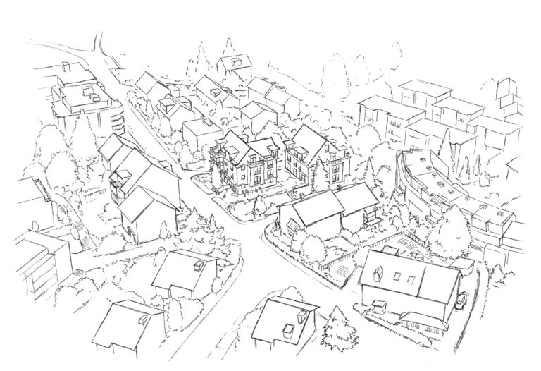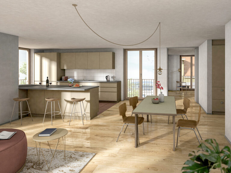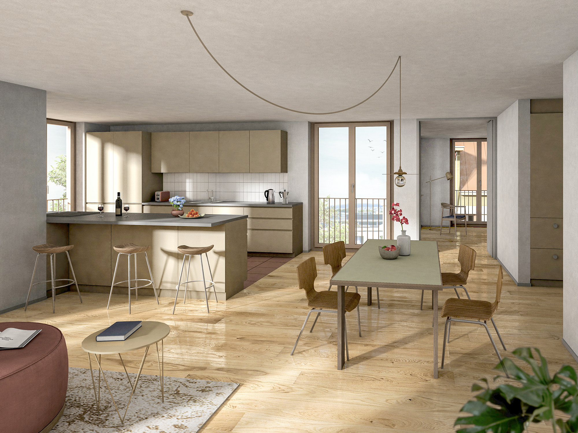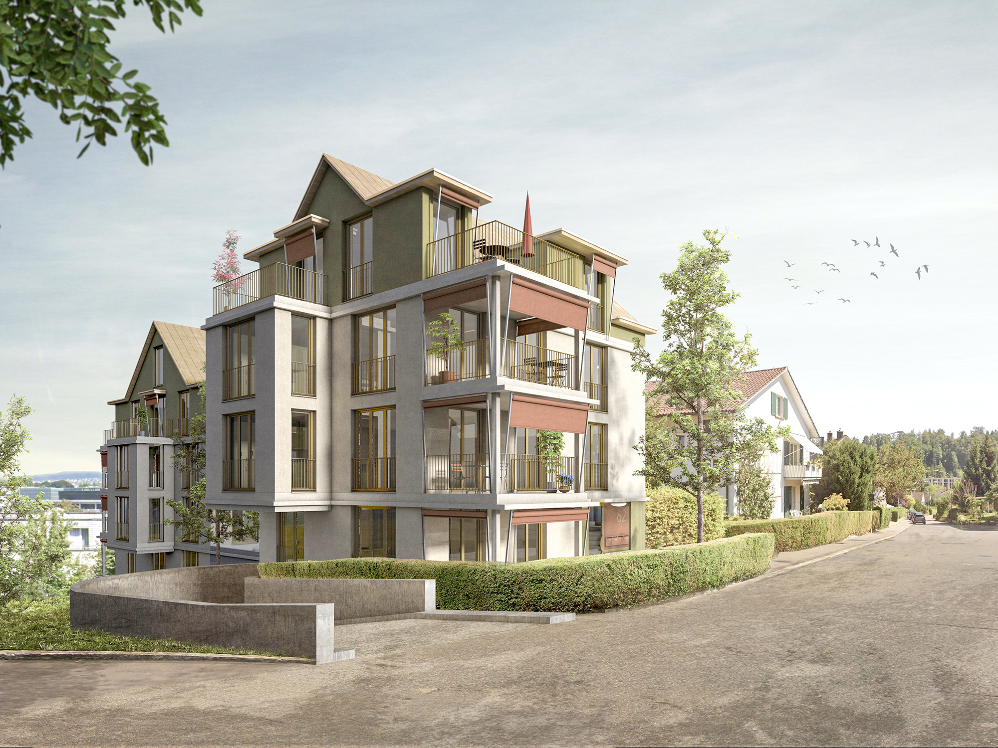 The buidings blend in with the green residential area and its typical small scaled formation, which is characterized by light-colored facades and lush front gardens. Inspired by the villa-style architecture that characterizes Zurich's lake basin and mountain slopes, the architectural design conveys a sense of distinguished living across the entire floor with views in all directions.