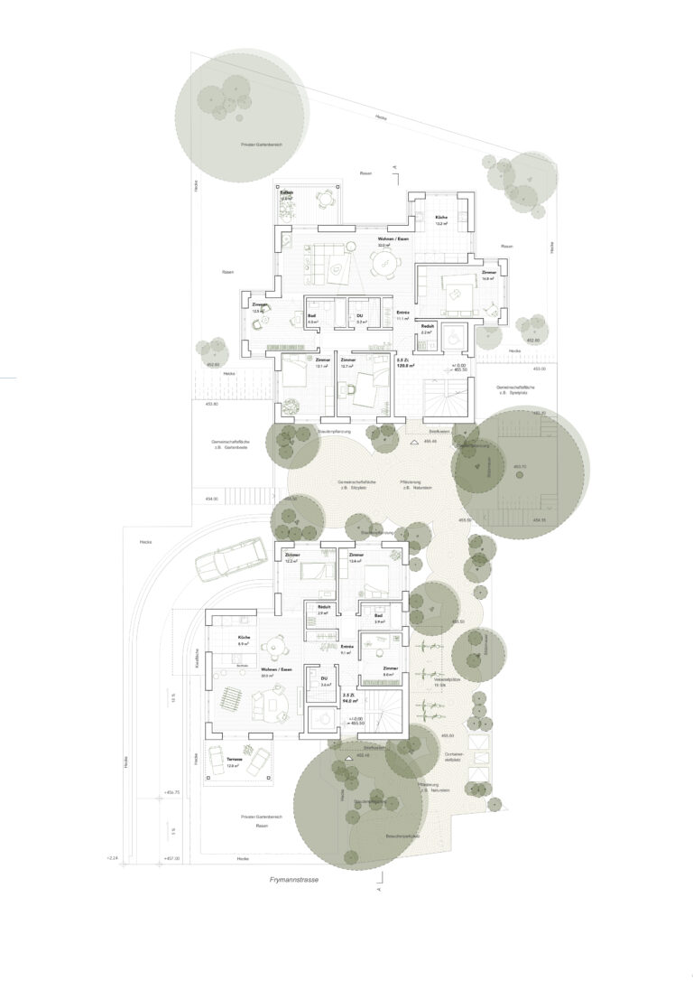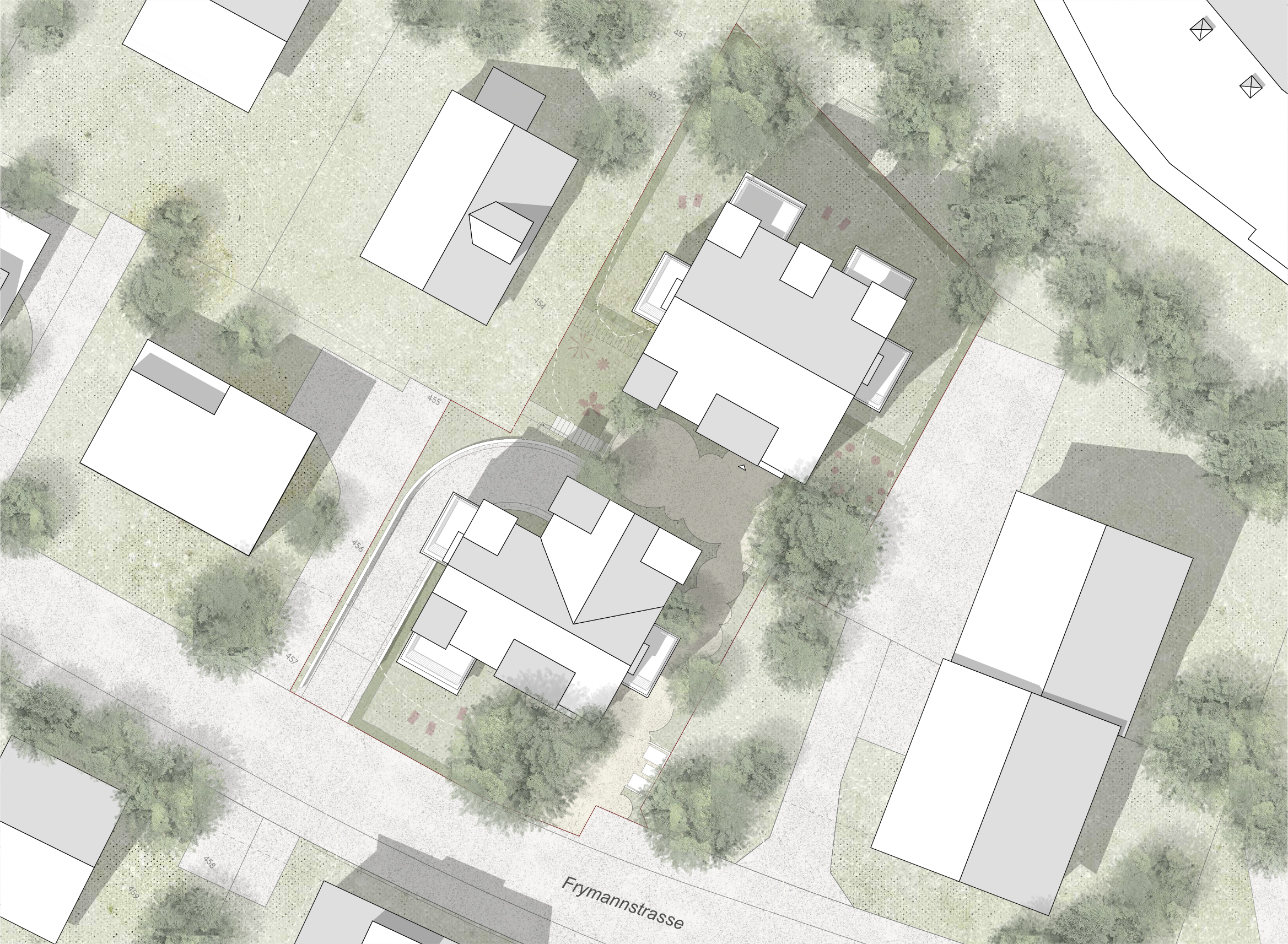 The sloping roofs continue the style of the residential neighborhood's roofs, which are mainly arranged on the eaves side, with a cross-gabled facade forming on the southern side of the north house. The communal outdoor space is formed between the buildings, with side garden steps leading to the sloping gardens, relaxation and play areas. The arrangement of the cores at the south-eastern corners of the buildings creates a clear address. The two new buildings, which are connected underground by a parking garage, appear as a self-evident and attractive ensemble for the residential quarter.